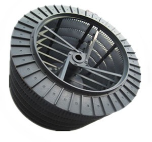 3、形成不了平面渦流:現行渦輪分級機的渦輪僅是一個簡單的直籠形轉子,無水平隔板,分級葉片也是用扁鋼做成,從而使形成的旋轉氣流不是平面渦流,而是螺旋氣流,并且在籠子 上部吸進氣體的流速較快,而下部吸進的氣流速度要慢些,因而影響分級效率。